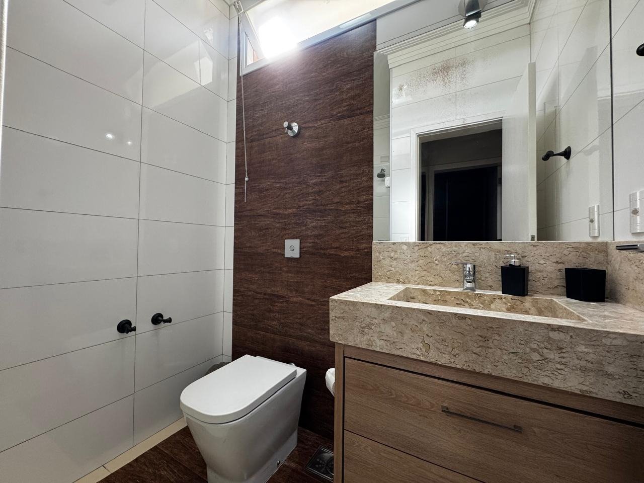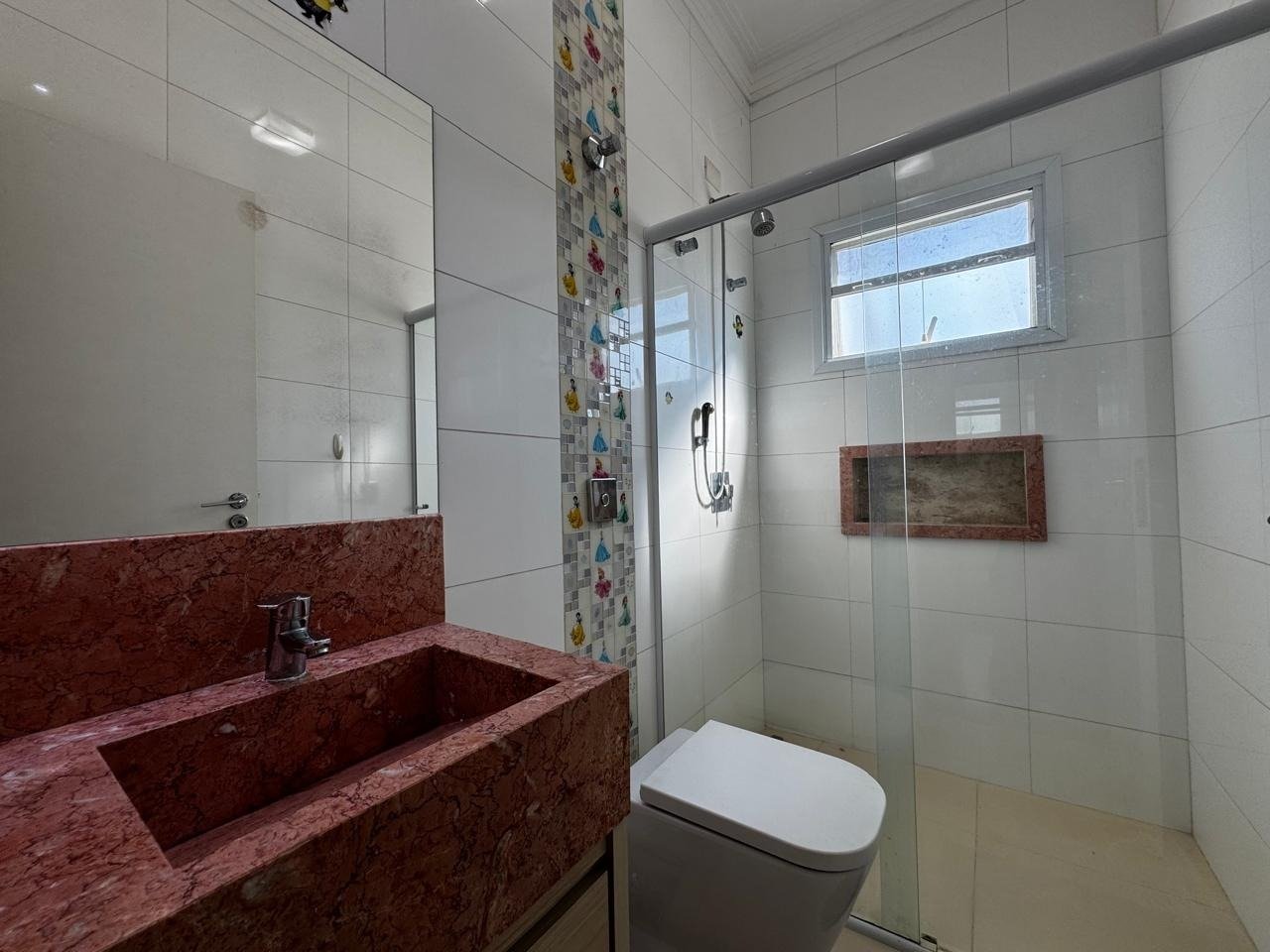 A Suíte Master dispõe de closet, banheiro duplo com duas pias e dois chuveiros, ar-condicionado, ventilador e porta-balcão com persiana elétrica.