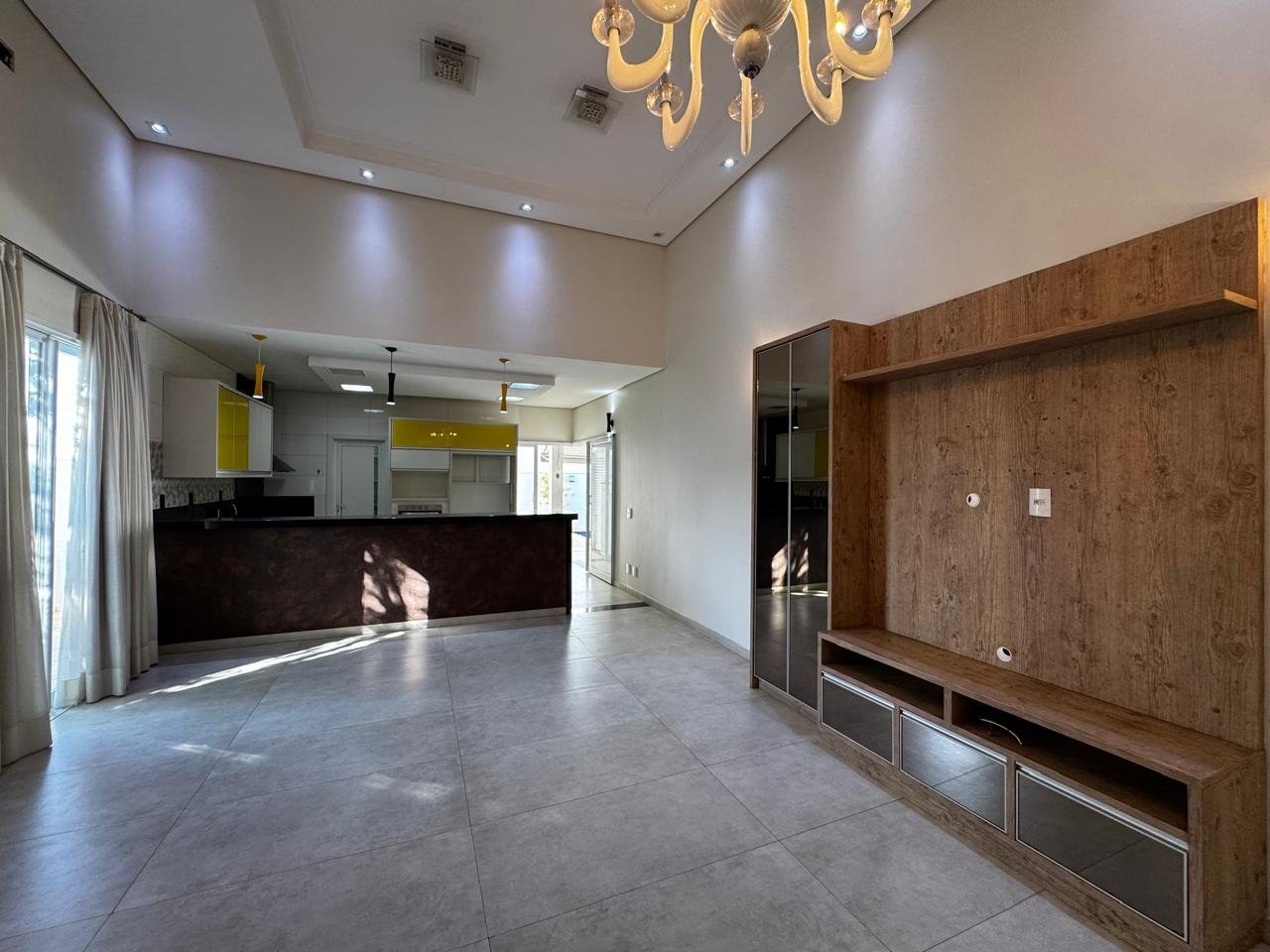A sala possui pé direito alto, painel rack planejado, cortinas, lustre e fechadura diferenciada, integrada à sala de jantar, criando um espaço amplo e acolhedor.